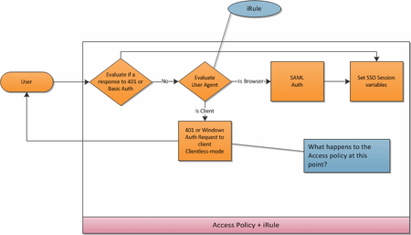 If browser, you could present a logon page or send a 401 response to collect credentials. If non-browser, you could send a 401 response to collect credentials. The 401 Response-thingy is a block in the visual policy editor. Once passed, it will fill out session.logon.last.username and session.logon.last.password (the password only if the auth supports it: Basic does, NTLM/Kerberos do not) for you. After the 401 you set an SSO Credential Mapping object, then the SAML auth or something else.
