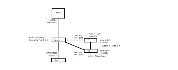 You can see topology below. I describe the two different switch ports F5. Untagged switch side everything is works. My problem tag switch side. I describe f5 port 1.2 tagged vlan 1002. Pool and virtual server is green. F5 can access this node. But external client don't access this virtual server ip. F5 version 11.6.0 build 4.0.420 . I'll share a few interesting experiment. I bring to the position disable port 1.2 (1.2 is tagged port) and everthing is works. But i change vlan id this time pool is down. Also one time this virtual server worked but non self ip :) . 2 switch connected same firewall and i write default route this firewall. I think that the issue is related to assymetric routing but assymetric routing configuration did not work well with. Why do you think the problem is originating? The only problem outside access.