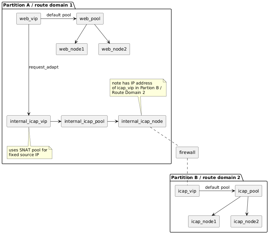 Now I need to access the same ICAP vip/pool from another (http) virtual on the same BigIP using a request adapt profile. The clue: the http virtual is located in a different partition than the ICAP virtual and each partition uses an own (non-default) route domain for separation purposes.