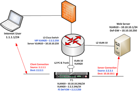 In this case, serverside traffic exits on vlan10 and response from server arrives on vlan20, as the VIP address is the source-ip of server-side traffic.