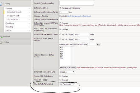 As Parameter: Specifies that the system normalizes and enforces path parameters. For each path parameter, the system removes it from URLs as part of the normalization process, finds a corresponding parameter in the security policy (first at the matching URL level, and if not found, then at the Global level), and enforces it according to its attributes like any other parameters.