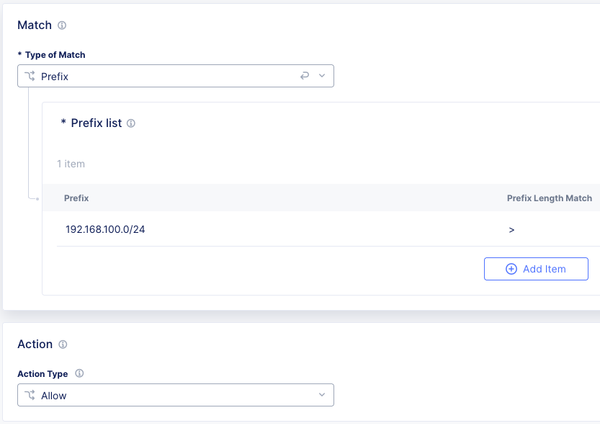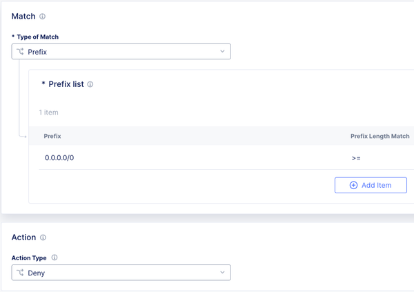 Repeat the action to create another BGP routing policy with the exact same parameters except the Action Type, which should be of type Deny.