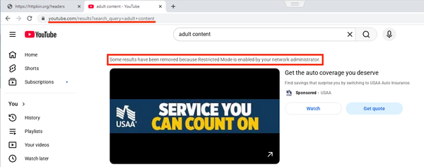 From a client computer, access youtube.com. An attempt to search for “adult content” results in the following: