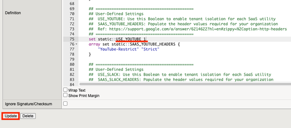 To enable the policy, set the value for “USE_YOUTUBE” from 0 to 1. Click Update.