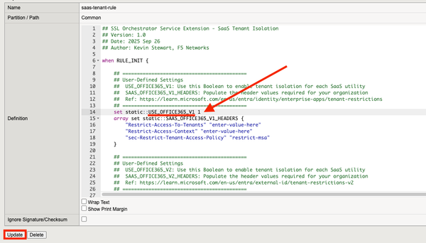 Then go back to the iRule “saas-tenant-rule” and scroll down to the “USE_TESTING” section
