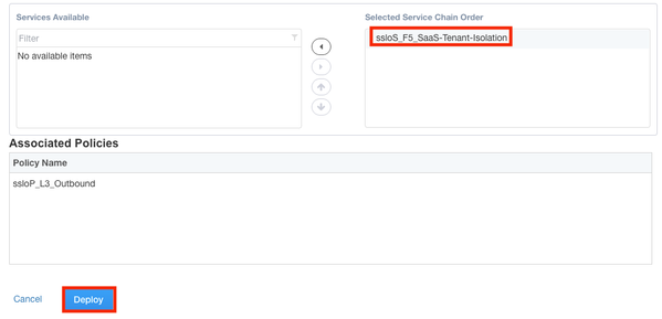 The installer creates a new Inspection Service named "ssloS_F5_SaaS-Tenant-Isolation". Add this Inspection Service to any Service Chain that can receive decrypted HTTP traffic. Service Extension Services will only trigger on decrypted HTTP, so can be inserted into Service Chains that may also see TLS bypass traffic (not decrypted). SSL Orchestrator will simply bypass this Service for anything that is not decrypted HTTP.