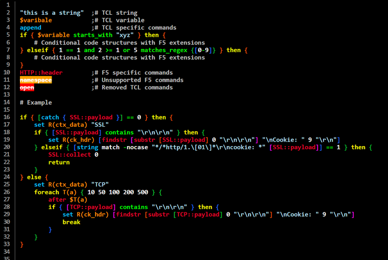 The Prism.js framework is widely used to highlight code blocks on websites. Even the DevCentral Page uses the Prism.js framework to highlight code boxes using the default TCL language definition contributed by Peter Chaplin to the Prism.js repository.