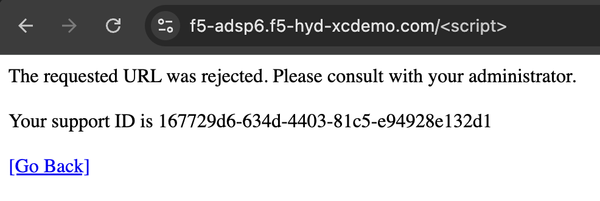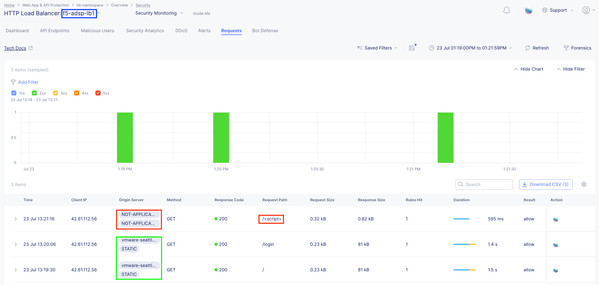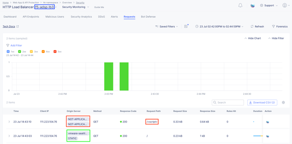 Fig 8: F5 Web Application Firewall blocking malicious requestsFrom the "Requests" section in Distributed Cloud console for the new workload LB, we can observe that benign requests are reaching the SMSv2 CE site deployed in VMware On-Prem environment and malign requests are being blocked by WAF, which won’t reach the origin server.