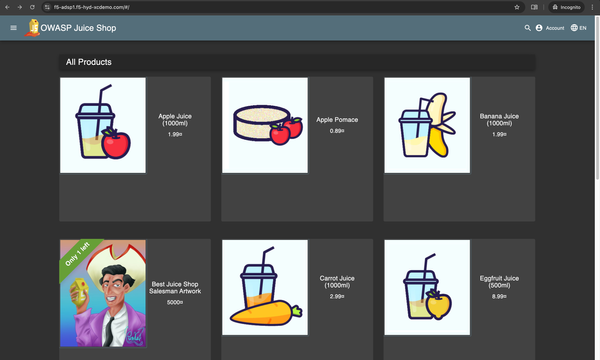 VMware application A (Juice Shop) deployed on LB f5-adsp1.f5-hyd-xcdemo.com