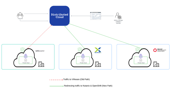 By further steering the traffic and finally completely redirecting to Nutanix and OCP results in migrating to Nutanix and OCP. The complete migration process is covered in the document, Migrating application traffic to Nutanix and OCP | F5 XC Solutions.
