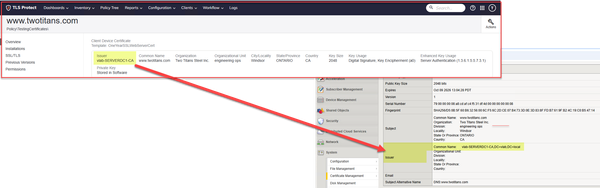In the above example, we see a new web service implemented at the FQDN of www.twotitans.com has just been discovered. Clicking the certificate, one thing to note is the certificate is self-signed. In real enterprise environments, there may be a need to re-issue such a certificate with the enterprise CA, as part of a solid security posture. Another, even more impactful use case is when all enterprise certificates need to be easily and quickly switched from a legacy CA to a new CA the enterprise wants to move to quickly and painlessly.