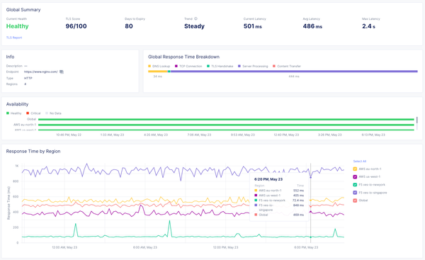 A hybrid DNS/GSLB toolset like the one found in F5’s Distributed Cloud is built for multicloud: F5 XC DNS Load Balancer steers to any origin, IPs or CNAMEs, so you can keep your preferred CDN while retaining an independent steering layer. This toolset is further complemented by Distributed Cloud Synthetic Monitoring. Designed for grey‑failure detection, it simulates user traffic against endpoints to quantify health and performance in real-time, to catch issues that liveness checks miss. All of these functions run on F5’s independent backbone and dedicated Customer Edge nodes. These private, encrypted paths to origins reduce exposure and keep performance stable when the public internet is noisy.