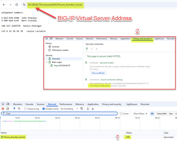If we follow the numbers in the above diagram, we see after directing Chrome to the S3 bucket “mybucket005” we have retrieved a phone list object holding some fictious contact names and numbers. We see that (1) the command has been successful in the S3 object retrieval, as per the HTTPS 200 Okay message. By expanding the Privacy and Security tab in Developer Tools (2), we have confirmed it; the hybrid quantum-resistant X15519Kyber algorithms were indeed used.