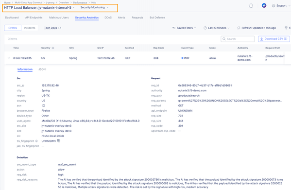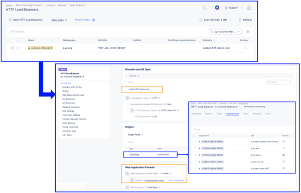 On the F5 Distributed Cloud Console, we created an HTTP Load Balancer named jy-nutanix-internal-5 serving the FQDN nutanix5.f5-demo.com. This load balancer distributes workloads across hybrid multicloud environments and is protected by a WAF policy named nutanix-demo: