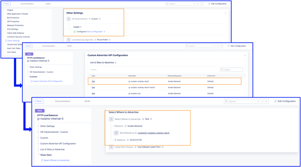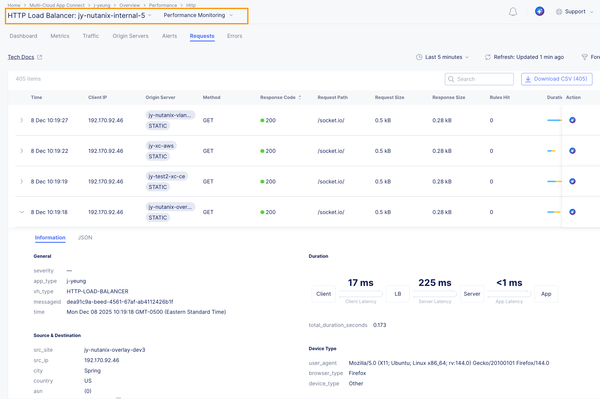 We advertised this HTTP Load Balancer with a Virtual IP (VIP) 10.10.111.175 to the CE jy-nutanix-overlay-dev3 deployed inside Nutanix Flow VPC dev3: