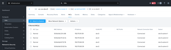 *Note: CE is named jy-nutanix-overlay-dev3 in the F5 Distributed Cloud Console and xc-ce-dev3 in the Nutanix Prism Central.