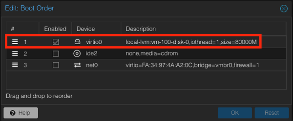 Finally, we modify the boot order of the VM for it to boot from the newly attached disk.
