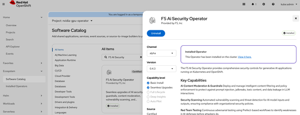 This article is a validated deployment runbook for F5 AI Security on OpenShift (version 4.20.14) with NVIDIA GPU nodes. It is based on the official Red Hat Operator installation baseline, in a real lab deployment on a 3×A40 GPU cluster. If you follow these steps in order, you will end up with a fully functional AI Security stack, avoiding the most common pitfalls along the way.