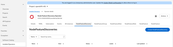 - After installation: Installed Operators → Node Feature Discovery → Create NodeFeatureDiscovery → Accept defaults