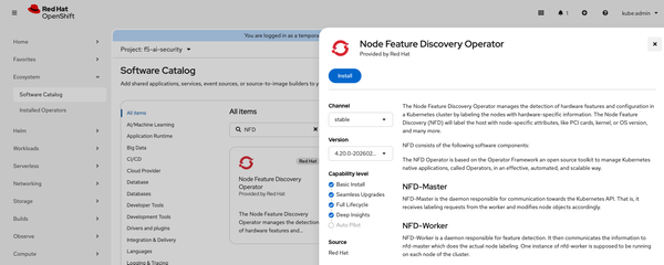 - OpenShift Console → Ecosystem → Software Catalog → Search Node Feature Discovery Operator → Install