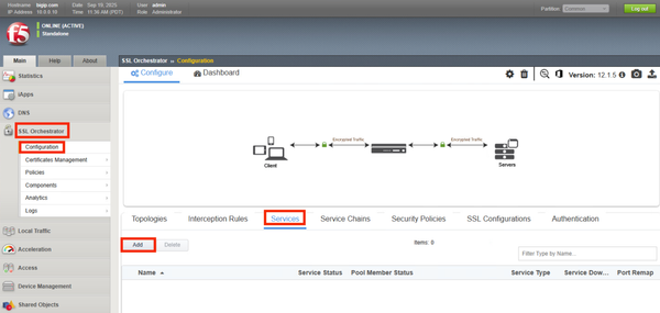 From the SSL Orchestrator Configuration screen select the Services tab then click Add