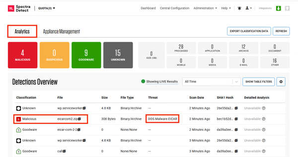 The Analytics Dashboard on the Spectra Detect Manager shows more details about the files processed.