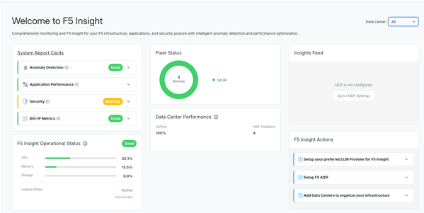 The F5 Insight Home Screen provides comprehensive monitoring for your F5 infrastructure, applications, and security posture. It features intelligent anomaly detection and performance optimization tools, giving administrators and users a centralized view of their BIG-IP fleet health and operational status.