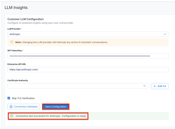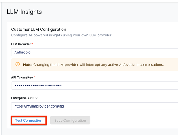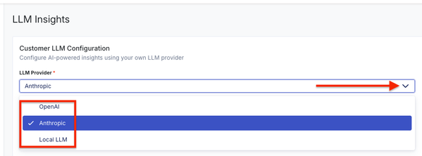 The AI Assistant connects to a configurable Large Language Model (LLM) backend. Supported providers include OpenAI, Anthropic, or a customer provided LLM.