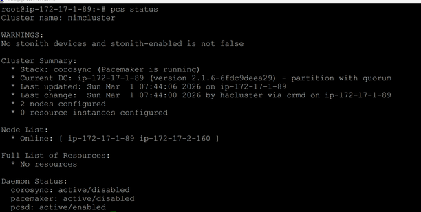 pcs cluster setup nimcluster --force ip-172-17-1-89