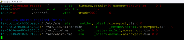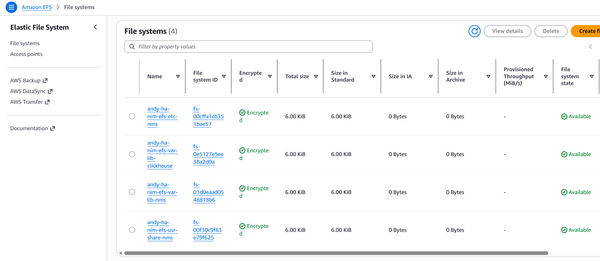 First, we are going to create four EFS volumes to hold important NIM configuration and state information that will be shared between nodes. These file systems will be mounted onto: /etc/nms, /var/lib/clickhouse, /var/lib/nms and /usr/share/nms inside the NIM node.