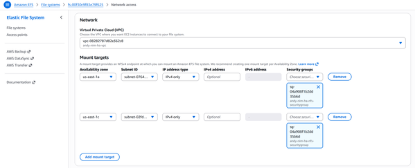 Edit the properties of each EFS file system and create a mount target in each AZ you intend to deploy a NIM node in, then restrict network access to only the NIM nodes by setting up an AWS Security Group. You may also consider more advanced authentication methods, but these aren't covered in this article.