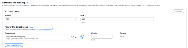 ⚠️NOTE ⚠️ if you are using Load balancing with TCP Protocol and terminating the TLS connection on the NIM node (EC2 instance), you must create a security group entry to allow TCP 443 from the connecting clients directly to the EC2 instance IP address. If you have trusted SSL/TLS server certificates, you may want to investigate a load balancer for TLS protocol.