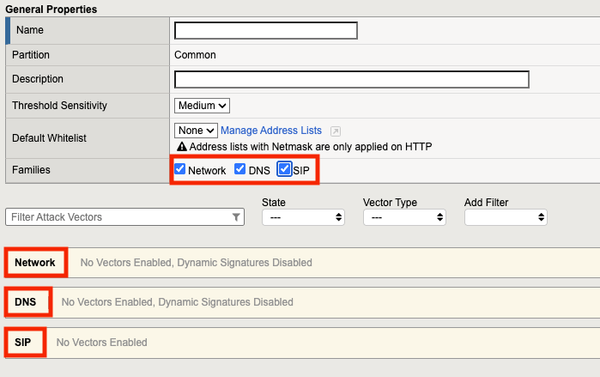 AFM DoS can be configured at a Device level along with the ability to apply more specific DoS profiles to Virtual Servers, which enable granular policy management. Protected Objects, for example, are objects that have a DoS Profile associated to them (vs Device DoS). Protection Profile thresholds can be configured for Network, DNS or SIP. Once the Protection Profiles is configured, it can be assigned to a Virtual Server.