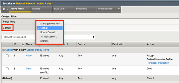 Each of the Contexts allows for the Actions of Accept, Drop or Reject. The Global and Route Domain Contexts also include the Accept Decisively Action.