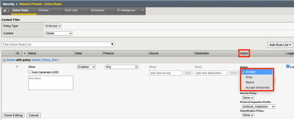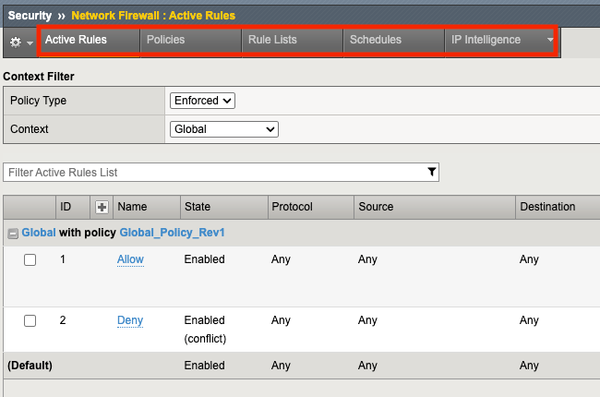 - Active Rules / Policies - To permit or deny traffic, either use Active Rules or Policies. The differences are shown below.