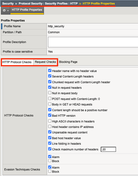 There are 2 protocols that can be configured. They are DNS and HTTP. To configure 'Protocol Security' a Security Profile is configured which is then assigned to the Virtual Server. An HTTP Security Profile has extensive options under Protocol Checks and Request Checks.