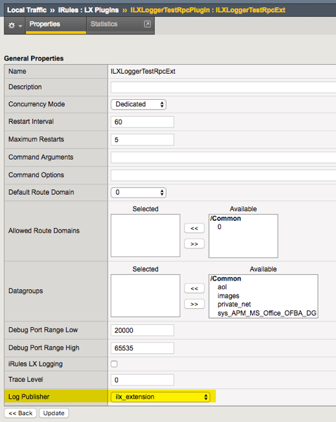 This is a bare bones example from Q&A posted by F5’s own Satoshi Toyosawa. I created an iRules LX Workspace (my workspace), an iRule (ilxtest), a plugin (ILXLOggerTestRpcPlugin), and an extension (ILXLoggerTestRpcExt). Configuration details for each: