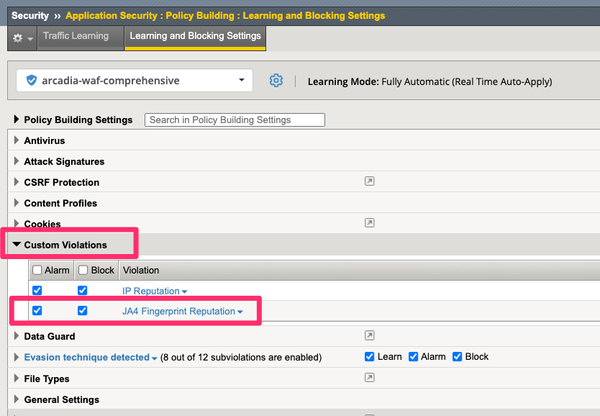 Finally, I modified the Learning and Blocking Settings of my policy to ensure that the new custom violation was set to Alarm and Block.