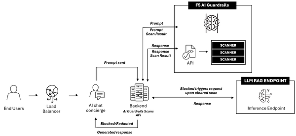 When the bank’s call center agents interact with the AI chat concierge application (see left side of diagram below) it is imperative to the bank’s CISO that these interactions are secure and maintain governance. For example, if the agent includes an account holder’s sensitive information in the prompt (see middle of diagram) and/or received an inappropriate response to relay to the account holder—the architecture needs the right solution in place to enforce organizational and access policies for proprietary and sensitive data flows between agents and AI. An example of such a solution is F5 AI Guardrails (see top of the diagram below).