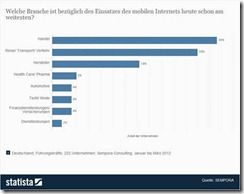 Den Statistiken zufolge gibt es große Unterschiede zwischen der Nutzung des mobilen Internet und den einzelnen Branchen. Die Unterschiede fallen auch je nach Befragungsmethode anders aus. Befragt man deutsche Führungskräfte zu den Vorreiter-Branchen beim Einsatz des mobilen Internets, liegt der Handel vorn, wie folgende Grafik zeigt.