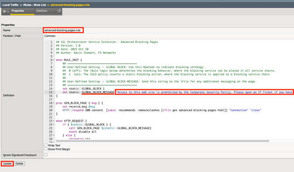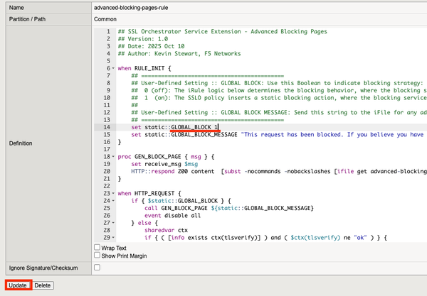 Find “set static::GLOBAL_BLOCK_MESSAGE” in the iRule and replace all the text within the quotation marks:
