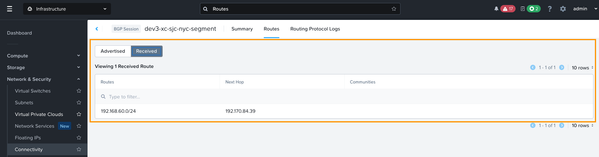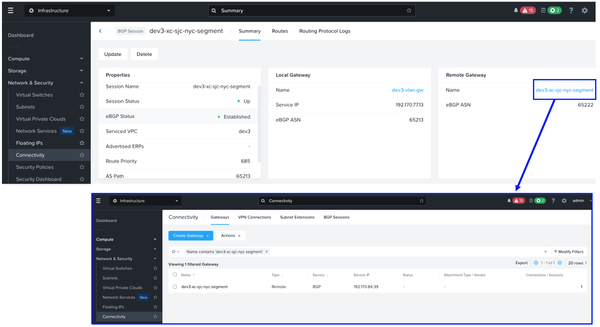 SJ VMs can now reach NYC VMs and vice versa, while continuing to use their Nutanix Flow VPC logical router as the default gateway: