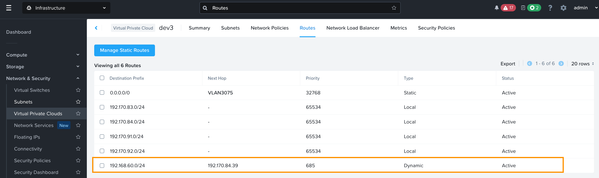 At the local site SJ, the SJ CE jy-nutanix-overlay-dev3 advertises the remote route originating from the NYC CE jy-nutanix-nyc to the Nutanix Flow BGP Gateway via BGP, and installs the route in the dev3 routing table: