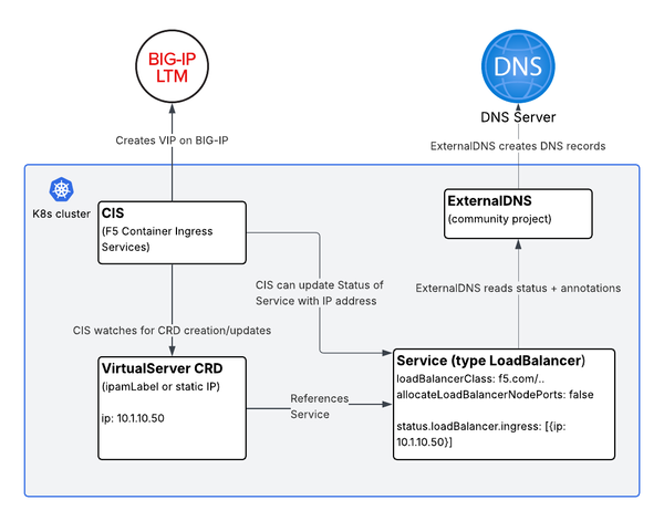 CIS can manage a VIP on BIG-IP via a VirtualServer CRD while simultaneously updating the status field of a Service of type LoadBalancer. ExternalDNS then reads that status field and creates DNS records.