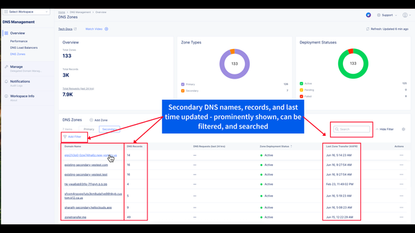 The DNS Zones overview shows zone-specific details: a comparison of zone types, deployment status, and includes the number of records and requests per 24hrs on a per-zone basis.
