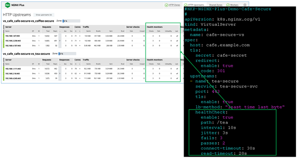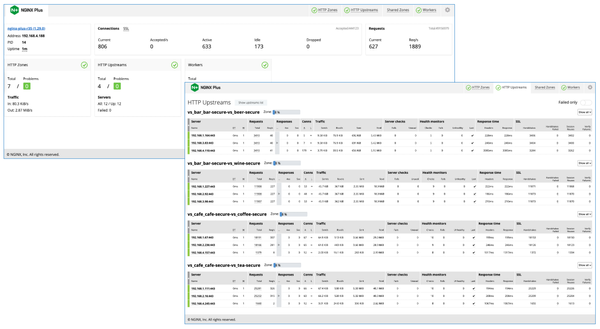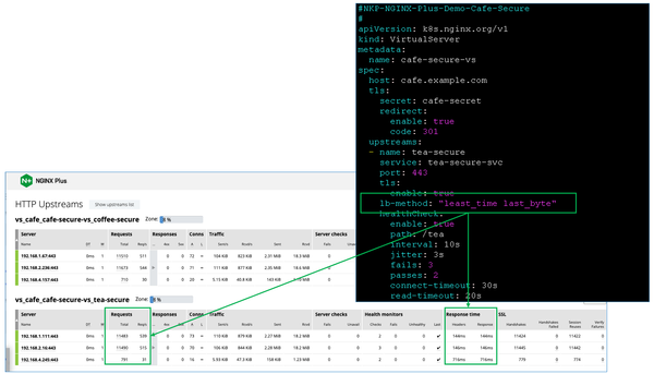 F5 NGINX Plus built-in dashboard provides instant updates with live metrics and highlights 503 response rejections, enabling real-time traffic control enforcement and monitoring.Advanced āLeast Timeā load balancing method in F5 NGINX Plus optimizes performance by routing traffic to the server with the lowest response time and fewest active connections, ensuring minimal latency and faster user experiences.