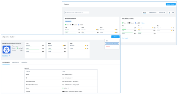 Management cluster and workload clusters on Nutanix Kubernetes Platform (NKP)NKP console with a demo workload cluster: nkp-demo-cluster-1