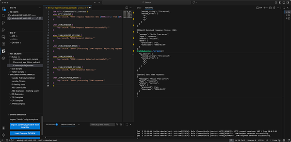 Now we need some client and server payload. Thankfully we have that covered with the script I shared in part one. We just need to unleash it! I have my Visual Studio Code IDE fired up with the F5 Extension and iRules editor marketplace extensions connected to my v21 BIG-IP, I have the iRule above loaded up in the center pane, and then I have the terminal on the right pane split three ways so I can a) generate traffic in the top terminal, b) view the server request/response in the middle terminal, and c) watch the logs from BIG-IP in the bottom terminal. Handy to have all that in one view in the IDE while working.