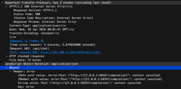 In the issue thread, you can literally see an example of that pattern: client FIN from n8n → Ollama, then 'HTTP/1.1 500 Internal Server Error' with a body indicating: 'context canceled.'
