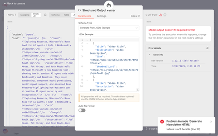 Hey, community. I wanted to share a story about how I built the n8n Labs workflow. It watches a YouTube channel, summarizes the latest videos with AI agents, and sends a clean HTML newsletter via Gmail. In the video, I show it working flawlessly with OpenAI. But before I got there, I spent a lot of time trying to copy the same flow using open source models through Ollama with the n8n Ollama node. My results were all over the map. I really wanted this to be a great “open source first” build. I tried many local models via Ollama, tuned prompts, adjusted parameters, and re‑ran tests. The outputs were always unpredictable: sometimes I’d get partial JSON, sometimes extra text around the JSON. Sometimes fields would be missing. Sometimes it would just refuse to stick to the structure I asked for. After enough iterations, I started to doubt whether my understanding of the agent setup was off. So, I built a quick proof inside the n8n Code node. If the AI Agent step is supposed to take the XML→JSON feed and reshape it into a structured list—title, description, content URL, thumbnail URL—then I should be able to do that deterministically in JavaScript and compare. I wrote a tiny snippet that reads the entries array, grabs the media fields, and formats a minimal output. And guess what? Voila. It worked on the first try and my HTML generator lit up exactly the way I wanted. That told me two things: one, my upstream data (HTTP Request + XML→JSON) was solid; and two, my desired output structure was clear and achievable without any trickery. With that proof in hand, I turned to OpenAI. I wired the same agent prompt, the same structured output parser, and the same workflow wiring—but swapped the Ollama node for an OpenAI chat model. It worked immediately. Fast, cheap, predictable. The agent returned a perfectly clean JSON with the fields I requested. My code node transformed it into HTML. The preview looked right, and Gmail sent the newsletter just like in the demo. So at that point, I felt confident the approach was sound and the transcript you saw in the video was repeatable—at least with OpenAI in the loop. Where does that leave Ollama and open source models? I’m not throwing shade—I love open source, and I want this path to be great. My current belief is the failure is somewhere inside the n8n Ollama node code path. I don’t think it’s the models themselves in isolation; I think the node may be mishandling one or more of these details: how messages are composed (system vs user). Whether “JSON mode” or a grammar/format hint is being passed, token/length defaults that cause truncation, stop settings that let extra text leak into the output; or the way the structured output parser constraints are communicated. If you’ve worked with local models, you know they can follow structure very well when you give them a strict format or grammar. If the node isn’t exposing that (or is dropping it on the floor), you get variability. To make sure this gets eyes from the right folks, my intent is to file a bug with n8n for the Ollama node. I’ll include a minimal, reproducible workflow: the same RSS fetch, the same XML→JSON conversion, the same agent prompt and required output shape, and a comparison run where OpenAI succeeds and Ollama does not. I’ll share versions, logs, model names, and settings so the team can trace exactly where the behavior diverges. If there’s a missing parameter (like format: json) or a message-role mix‑up, great—let’s fix it. If it needs a small enhancement to pass a grammar or schema to the model, even better. The net‑net is simple: for AI agents inside n8n to feel predictable with Ollama, we need the node to enforce reliably structured outputs the same way the OpenAI path does. That unlocks a ton of practical automation for folks who prefer local models. In the meantime, if you’re following the lab and want a rock‑solid fallback, you can use the Code node to do the exact transformation the agent would do. Here’s the JavaScript I wrote and tested in the workflow: const entries = $input.first().json.feed?.entry ?? []; function truncate(str, max) { if (!str) return ''; const s = String(str).trim(); return s.length > max ? s.slice(0, max) + '…' : s; // If you want total length (including …) to be max, use: // return s.length > max ? s.slice(0, Math.max(0, max - 1)) + '…' : s; } const output = entries.map(entry => { const g = entry['media:group'] ?? {}; return { title: g['media:title'] ?? '', description: truncate(g['media:description'], 60), contentUrl: g['media:content']?.url ?? '', thumbnailUrl: g['media:thumbnail']?.url ?? '' }; }); return [{ json: { output } }]; That snippet proves the data is there and your HTML builder is fine. If OpenAI reproduces the same structured JSON as the code, and Ollama doesn’t, the issue is likely in the node’s request/response handling rather than your workflow logic. I’ll keep pushing on the bug report so we can make agents with Ollama as predictable as they need to be. Until then, if you want speed and consistency to get the job done, OpenAI works great. If you’re experimenting with open source, try enforcing stricter formats and shorter outputs—and keep an eye on what the node actually sends to the model. As always, I’ll share updates, because I love sharing knowledge—and I want the open-source path to shine right alongside the rest of our AI, agents, n8n, Gmail, and OpenAI workflows. As always, community, if you have a resolution and can pull it off, please share!